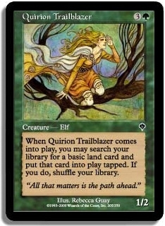 When Quirion Trailblazer comes into play you may search your library for a basic land card and put that card into play tapped. If you do shuffle your library.