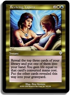 Reveal the top three cards of your library and put one of them into your hand. You gain life equal to that card's converted mana cost. Put the other cards revealed this way into your graveyard.