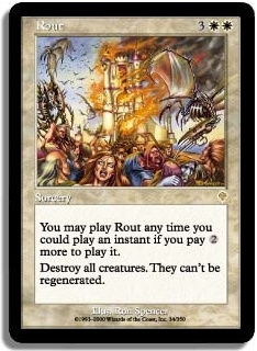 You may play Rout any time you could play an instant if you pay 2 more to play it. Destroy all creatures. They can't be regenerated.