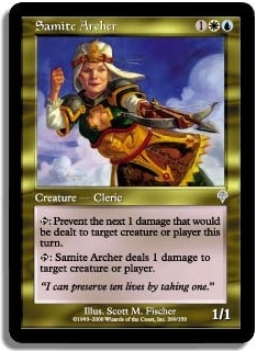 T: Prevent the next 1 damage that would be dealt to target creature or player this turn. T: Samite Archer deals 1 damage to target creature or player.