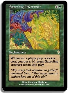 Whenever a player pays a kicker cost you put a 1/1 green Saproling creature token into play.
