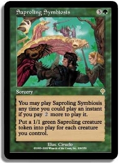 You may play Saproling Symbiosis any time you could play an instant if you pay 2 more to play it. Put a 1/1 green Saproling creature token into play for each creature you control.