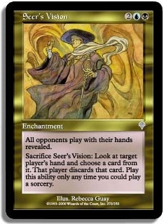 All opponents play with their hands revealed. Sacrifice Seer's Vision: Look at target player's hand and choose a card from it. That player discards that card. Play this ability only any time you could play a sorcery.