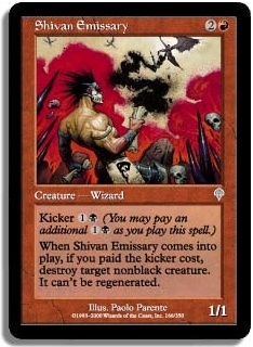 Kicker 1B (You may pay an additional 1B as you play this spell.) When Shivan Emissary comes into play if you paid the kicker cost destroy target nonblack creature. It can't be regenerated.