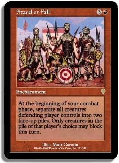 At the beginning of your combat phase, separate all creaures defending player controls into two face-up piles. Only creatures in the pile of that player's choice may block this turn.