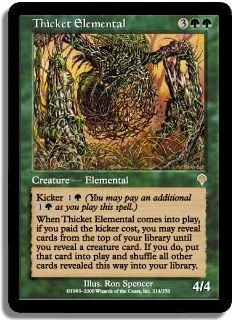 Kicker 1G (You may pay an additional 1G as you play this spell.) When Thicket Elemental comes into play if you paid the kicker cost you may reveal cards from the top of your library until you reveal a creature card. If you do put that card into play and shuffle all other cards revealed this way into your library.