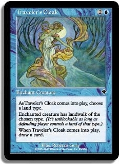 As Traveler's Cloak comes into play choose a land type. Enchanted creature has landwalk of the chosen type. (It's unblockable as long as defending player controls a land of that type.) When Traveler's Cloak comes into play draw a card.