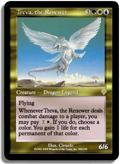 Flying Whenever Treva the Renewer deals combat damage to a player you may pay 2W. If you do choose a color. You gain 1 life for each permanent of that color.