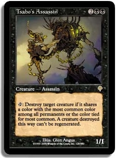 T: Destroy target creature if it shares a color with the most common color among all permanents or the color tied for most common. A creature destroyed this way can't be regenerated.
