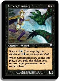 Kicker 1U (You may pay an additional 1U as you play this spell.) When Urborg Emissary comes into play if you paid the kicker cost return target permanent to its owner's hand.