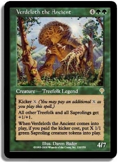 Kicker X (You may pay an additional X as you play this spell.) All other Treefolk and all Saprolings get +1/+1. When Verdeloth the Ancient comes into play if you paid the kicker cost put X 1/1 green Saproling creature tokens into play.