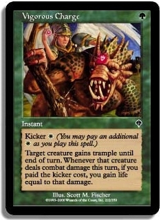 Kicker W (You may pay an additional W as you play this spell.) Target creature gains trample until end of turn. Whenever that creature deals combat damage this turn if you paid the kicker cost you gain life equal to that damage.
