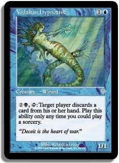 2B T: Target player discards a card from his or her hand. Play this ability only any time you could play a sorcery.