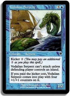 Kicker 2 (You may pay an additional 2 as you play this spell.) Vodalian Serpent can't attack unless defending player controls an island. If you paid the kicker cost Vodalian Serpent comes into play with four +1/+1 counters on it.