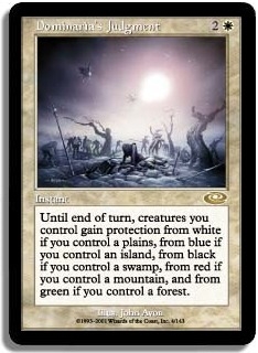 Until end of turn creatures you control gain protection from white if you control a plains from blue if you control an island from black if you control a swamp from red if you control a mountain and from green if you control a forest.