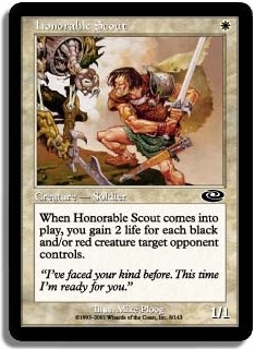 When Honorable Scout comes into play you gain 2 life for each black and/or red creature target opponent controls.