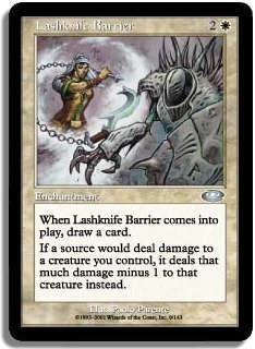 When Lashknife Barrier comes into play draw a card. If a source would deal damage to a creature you control it deals that much damage minus 1 to that creature instead.