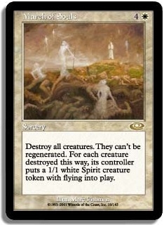 Destroy all creatures. They can't be regenerated. For each creature destroyed this way its controller puts a 1/1 white Spirit creature token with flying into play.