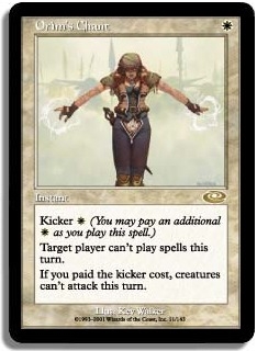 Kicker W (You may pay an additional W as you play this spell.) Target player can't play spells this turn. If you paid the kicker cost creatures can't attack this turn.