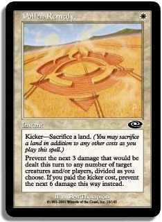 KickerSacrifice a land. (You may sacrifice a land in addition to any other costs as you play this spell.) Prevent the next 3 damage that would be dealt this turn to any number of target creatures and/or players divided as you choose. If you paid the kicker cost prevent the next 6 damage this way instead.