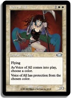 Flying As Voice of All comes into play choose a color. Voice of All has protection from the chosen color.