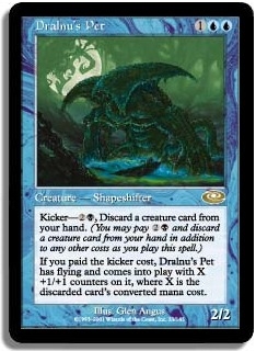 Kicker2B Discard a creature card from your hand. (You may pay 2B and discard a creature card from your hand in addition to any other costs as you play this spell.) If you paid the kicker cost Dralnu's Pet has flying and comes into play with X +1/+1 counters on it where X is the discarded card's converted mana cost.
