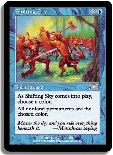 As Shifting Sky comes into play choose a color. All nonland permanents are the chosen color.