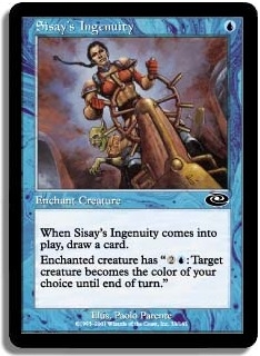 When Sisay's Ingenuity comes into play draw a card. Enchanted creature has "2U: Target creature becomes the color of your choice until end of turn."