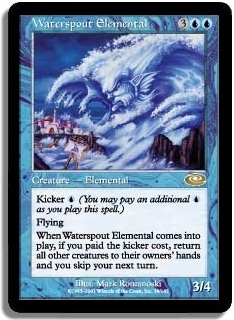 Kicker U (You may pay an additional U as you play this spell.) Flying When Waterspout Elemental comes into play if you paid the kicker cost return all other creatures to their owners' hands and you skip your next turn.
