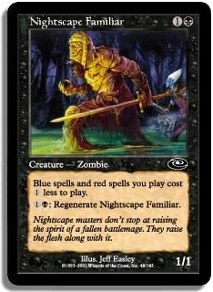 Blue spells and red spells you play cost 1 less to play. 1B: Regenerate Nightscape Familiar.