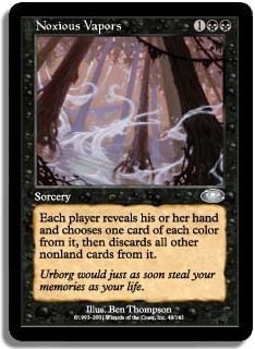 Each player reveals his or her hand and chooses one card of each color from it then discards all other nonland cards from it.