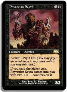 KickerPay 3 life. (You may pay 3 life in addition to any other costs as you play this spell.) If you paid the kicker cost Phyrexian Scuta comes into play with two +1/+1 counters on it.