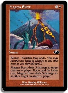 KickerSacrifice two lands. (You may sacrifice two lands in addition to any other costs as you play this spell.) Magma Burst deals 3 damage to target creature or player. If you paid the kicker cost Magma Burst deals 3 damage to another target creature or player.