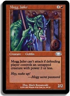 Mogg Jailer can't attack if defending player controls an untapped creature with power 2 or less.