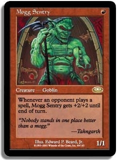 Whenever an opponent plays a spell Mogg Sentry gets +2/+2 until end of turn.