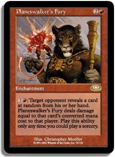 3R: Target opponent reveals a card at random in his or her hand. Planeswalker's Fury deals damage equal to that card's converted mana cost to that player. Play this ability only any time you could play a sorcery.