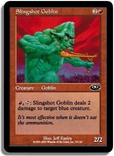 R T: Slingshot Goblin deals 2 damage to target blue creature.