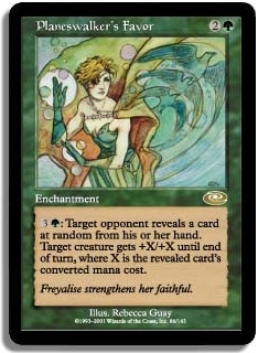 3G: Target opponent reveals a card at random in his or her hand. Target creature gets +X/+X until end of turn where X is the revealed card's converted mana cost.