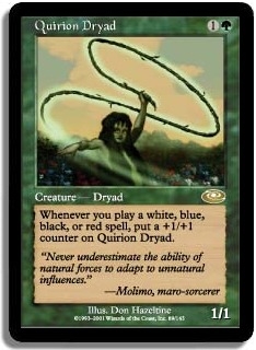Whenever you play a white blue black or red spell put a +1/+1 counter on Quirion Dryad.