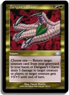 Choose one Return target creature card from your graveyard to your hand; or Darigaaz's Charm deals 3 damage to target creature or player; or target creature gets +3/+3 until end of turn.