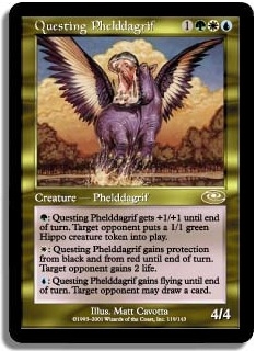 G: Questing Phelddagrif gets +1/+1 until end of turn. Target opponent puts a 1/1 green Hippo creature token into play. W: Questing Phelddagrif gains protection from black and from red until end of turn. Target opponent gains 2 life. U: Questing Phelddagrif gains flying until end of turn. Target opponent may draw a card.