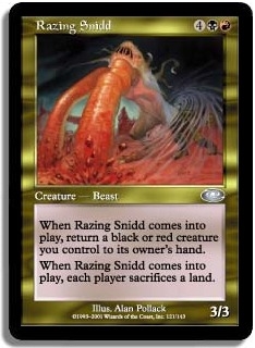 When Razing Snidd comes into play return a black or red creature you control to its owner's hand. When Razing Snidd comes into play each player sacrifices a land.