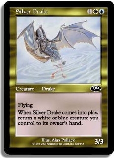 Flying When Silver Drake comes into play return a white or blue creature you control to its owner's hand.