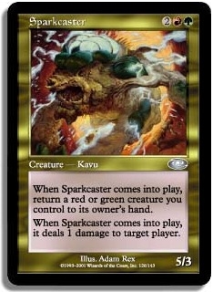 When Sparkcaster comes into play return a red or green creature you control to its owner's hand. When Sparkcaster comes into play it deals 1 damage to target player.