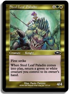 First strike When Steel Leaf Paladin comes into play return a green or white creature you control to its owner's hand.