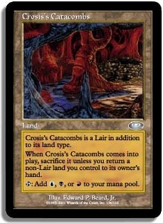 Crosis's Catacombs is a Lair in addition to its land type. When Crosis's Catacombs comes into play sacrifice it unless you return a non-Lair land you control to its owner's hand. T: Add U B or R to your mana pool.