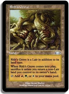 Rith's Grove is a Lair in addition to its land type. When Rith's Grove comes into play sacrifice it unless you return a non-Lair land you control to its owner's hand. T: Add R G or W to your mana pool.