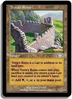 Treva's Ruins is a Lair in addition to its land type. When Treva's Ruins comes into play sacrifice it unless you return a non-Lair land you control to its owner's hand. T: Add G W or U to your mana pool.