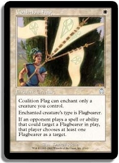 Coalition Flag can enchant only a creature you control. Enchanted creature's type is Flagbearer. If a spell or ability an opponent controls could target a Flagbearer in play that player chooses at least one Flagbearer as a target.