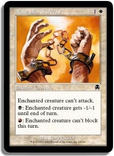 Enchanted creature can't attack. B: Enchanted creature gets -1/-1 until end of turn. R: Enchanted creature can't block this turn.
